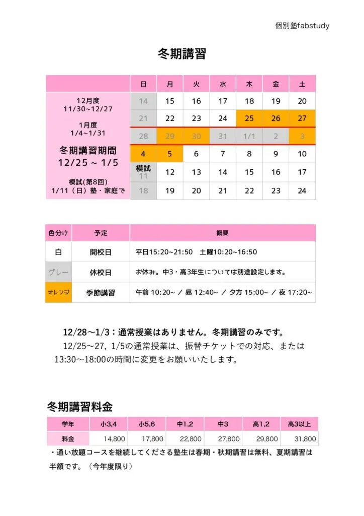 冬期講習のおしらせ 2025 12/03 イベント お知らせ 2025年12月1日2025年12月3日8日間×2時間⌚️(中3は4時間)です。私は体調管理を頑張ります。 イベント お知らせ よかったらシェアしてね! URLをコピーしました! URLをコピーしました! Webサイトをリニューアルしました 受講可能な曜日・時間 この記事を書いた人 fabstudy2023 代表 かわかみあきら 関連記事 受講可能な曜日・時間 2025年12月2日 Webサイトをリニューアルしました 2025年12月1日