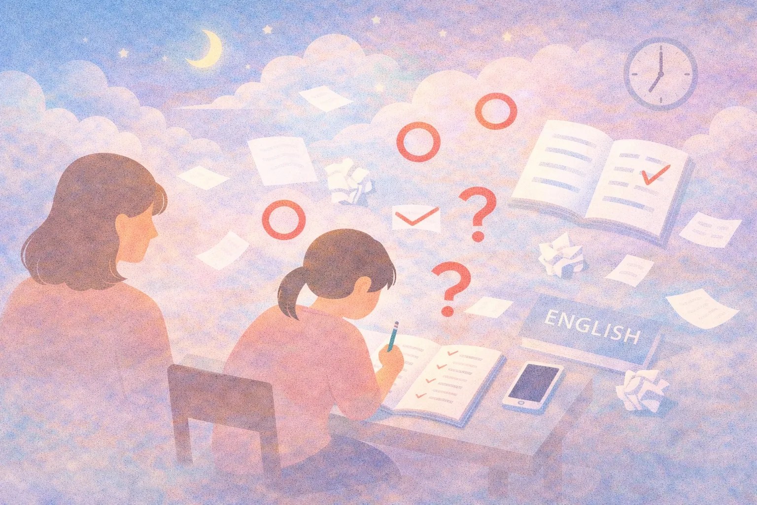 英語のワークを開いて丸付けをしているのを見て「ちゃんとやってるね」で終わる。翌日も同じ流れ。この場面が続いているなら、英語は「作業」だけが進んでいる状態です。